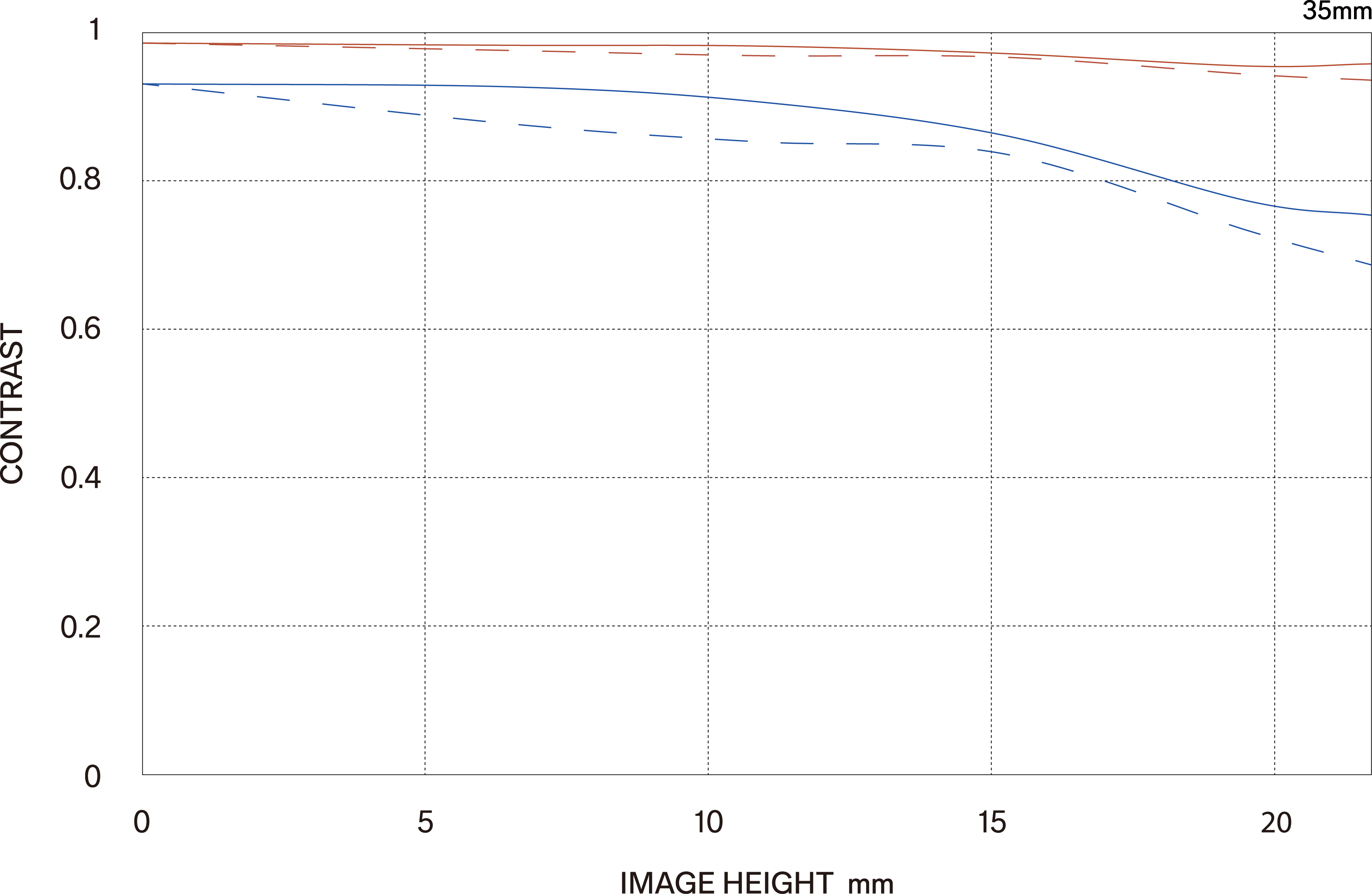 The MTF (Modulation Transfer Function) is one of the measurements for evaluating a lens’ performance, and it shows how faithfully the contrast of the subject can be reproduced on the image plane. The horizontal axis shows the image height (distance from the center of the image in mm) and the vertical axis shows the contrast value (maximum value is 1).